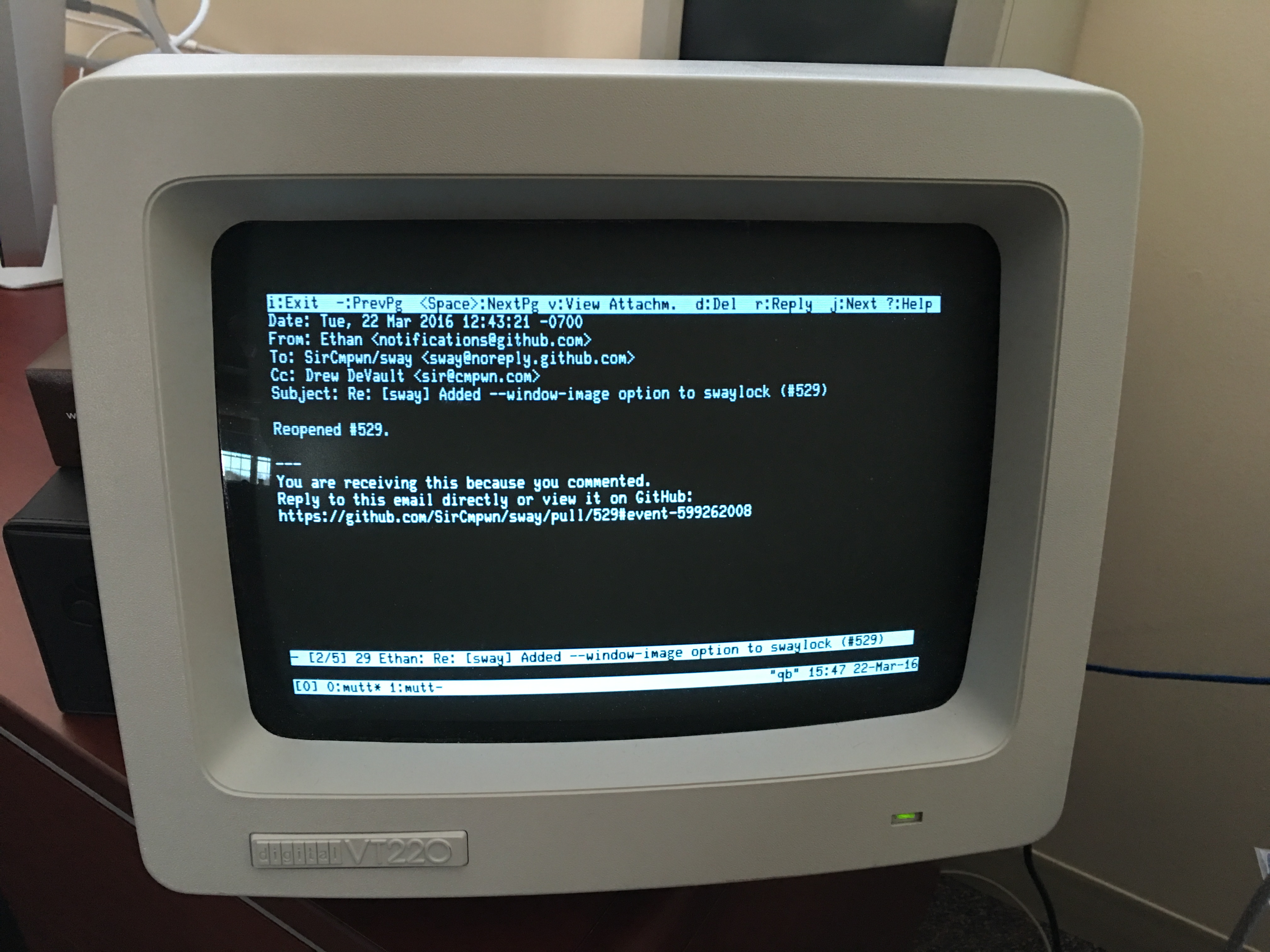 Which spawns a terminal whose window title is __VT220 running tmux attached to the session running on the terminal. The for_window rule I added to my sway config automatically moves this to the VT220 fake output and tada! It works. Now I have a nice and comfortable way to use my terminal to read emails at work. Now if only I could convince people to stop sending me HTML emails! I just bought a second VT220 for use at home, too. Life’s good~