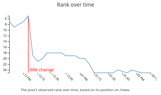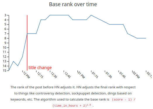 This post had its title changed at around 09-11-17 12:10 UTC, and had the rank artificially adjusted to push it further down the front page. We can tell that the drop was artificial just by correlating it with the known moderator action, but we can also compare it against the computed base rank: