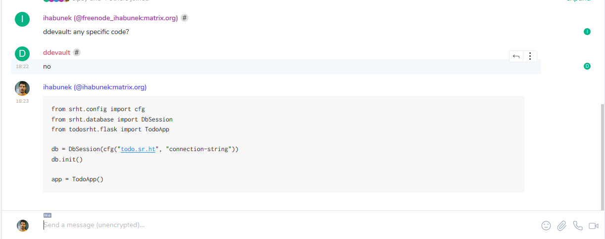 Here’s another example: how about a nice UI for long messages, such as pasted code snippets? Let’s examine how three different clients would implement this: (1) a GUI client, (2) a TUI3 client, and (3) a client which refuses to implement it or is unmaintained4.