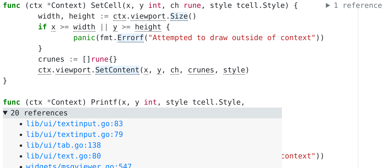 And here are the docs for generating your own: annotations on git.sr.ht. Currently annotators are available for C and Go, and I intend to write another for Python. For the rest, I’ll be relying on the community to put together annotators for their favorite programming languages, and to help me expand on the ones I’ve built.