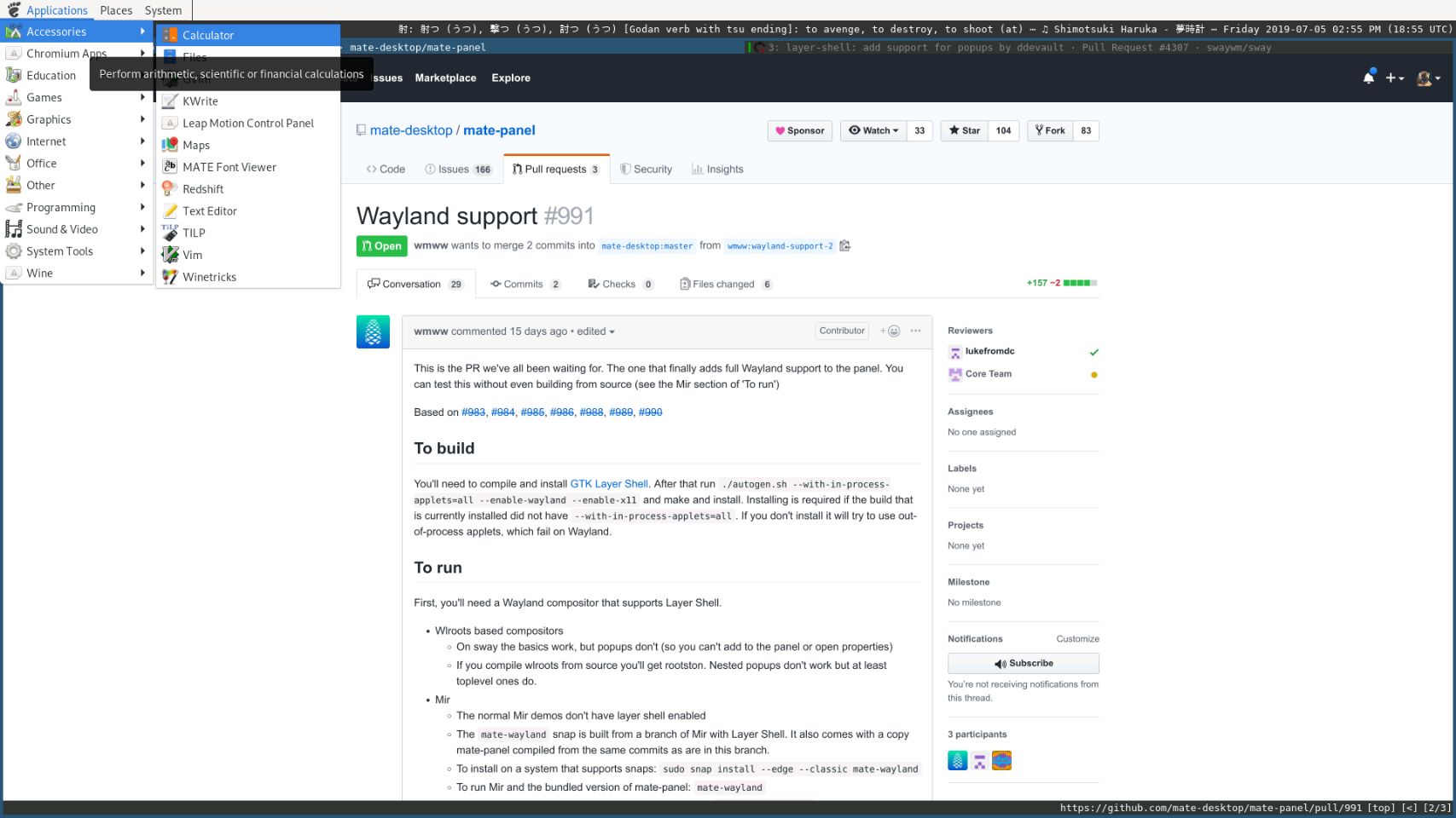 First, Wayland news. I’m happy to share with you that the Wayland book is now more than halfway complete, and I’ve made the drafts available online for a discounted price: The Wayland Protocol. Thanks to all of my collaborators and readers who volunteered to provide feedback! There’s more Wayland-related news still, as this month marked the release of sway 1.2 and wlroots 0.7.0. I like this release because it’s light on new features - showing that sway is maturing into a stable and reliable Wayland desktop. The features which were added are subtle and serve to improve sway’s status as a member of the broader ecosystem - sway 1.2 supports the new layer shell support in the MATE panel, and the same improvements are already helping with the development of other software.