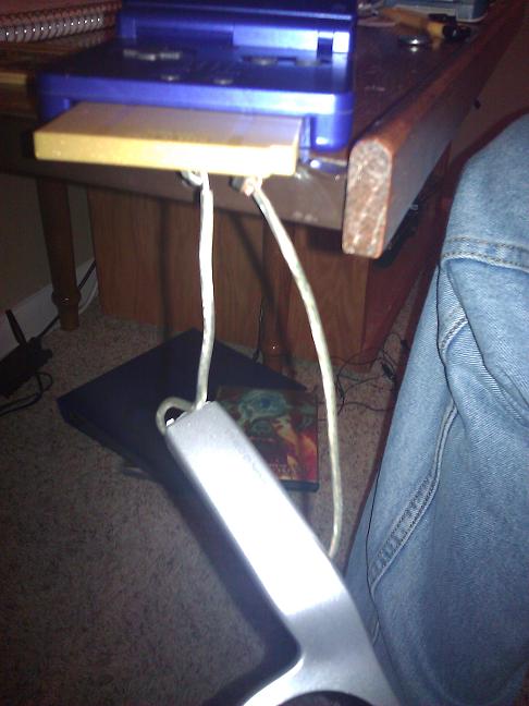 I went to look for something to hold the battery with. After a lot of searching, I stumbled upon some old noise cancelling headphones that had a mount for a single AA battery. I abused the headphones until just the mount remained, and put a fresh battery inside. I trapped the leads coming out of the cartridge between the battery’s contacts and the walls of the mount. I then stuck the cartridge back into my GameBoy Advance and turned it on.