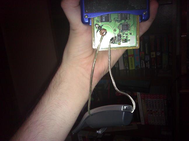 The GameBoy showing the successfully saved game. The front of the case is to the left, only half of the case is actually inserted. This allowed me to make sure that the cartridge meets the contacts in the GameBoy itself, but still let me meddle around inside without taking it out.