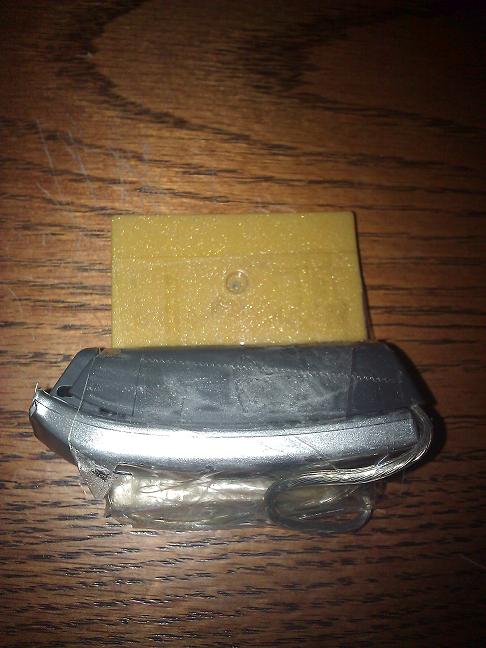 Attached to the game was a battery powering the SRAM. I pried it out of its casing, leaving the contacts in place. Then I looked for some wiring and found speaker wire. This I stripped. I wound some of it around each contact and left it aside. Then, using the lighter to soften the plastic, and scissors to manipulate it, I put some holes in the side of the casing so the wires could get out. I put the game back in the case and led the wires out.